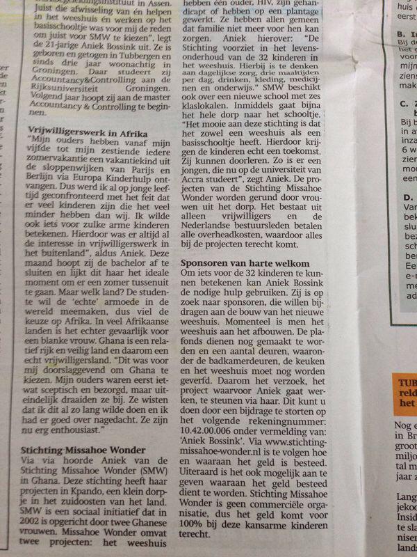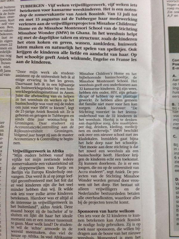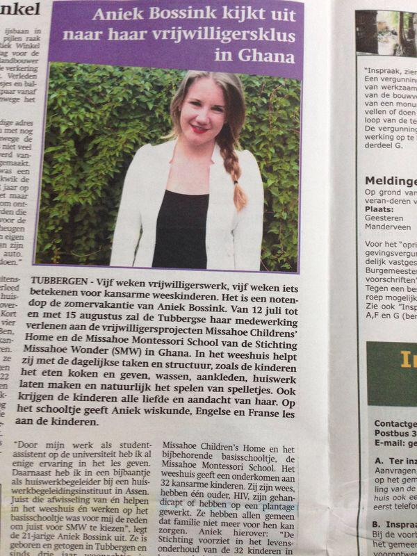 11/06/2014- Op 12 juli vertrekt Aniek Bossink voor 5 weken naar Kpando, Ghana om vrijwilligerswerk te doen in het kindertehuis Missahoe en om les te geven op de Missahoe Montessori School. Aniek stond 10 juni jl. in de krant “Op en rond de Essen”. Aniek is ook bezig met het inzamelen van fondsen voor SMW.